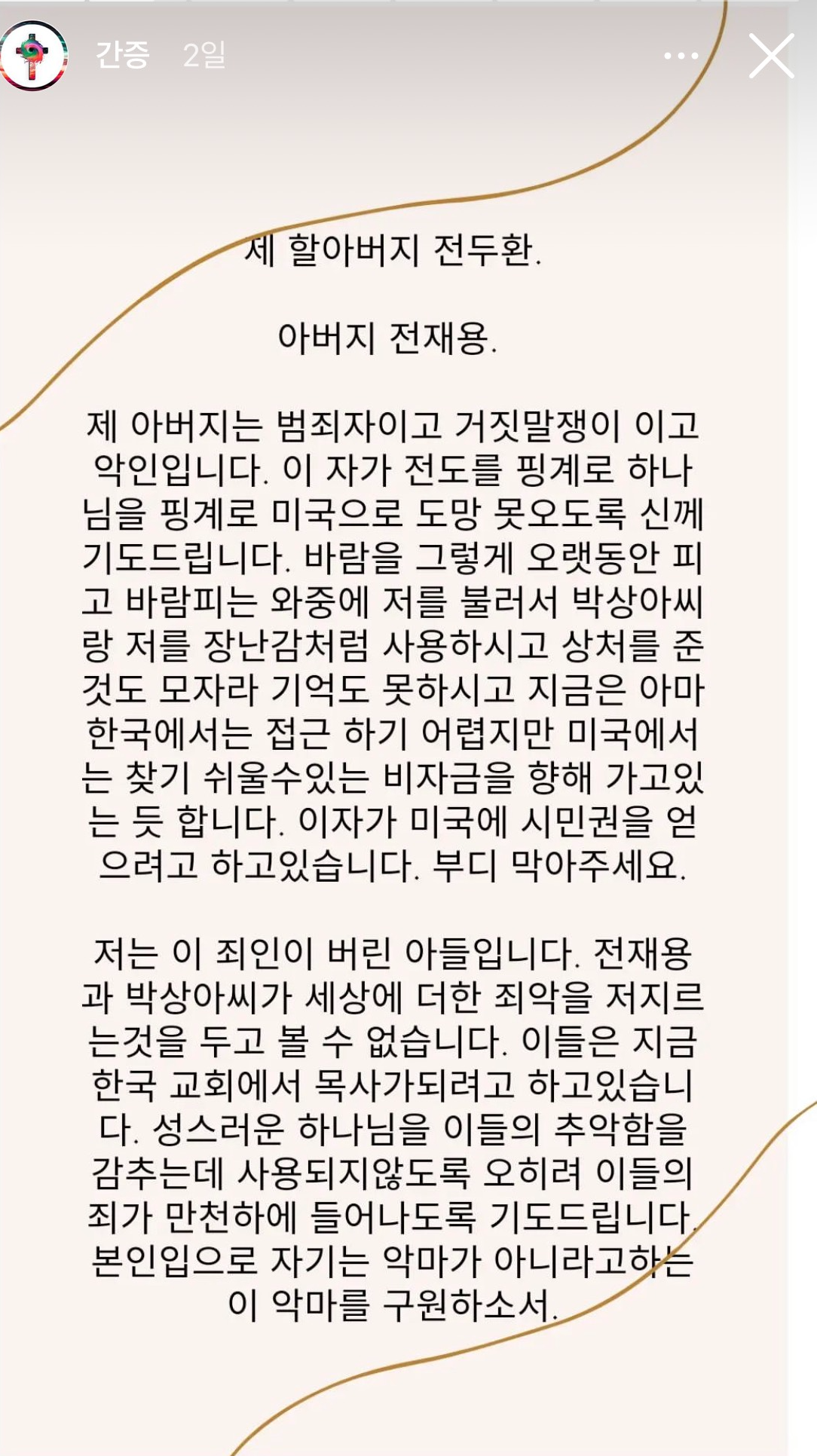 그가 올린 사진은 많았으나 간추려 중요한 자료만 올리겠다. 출처는 전우원의 인스타그램 hope.with.jesus에서 가져왔다.
